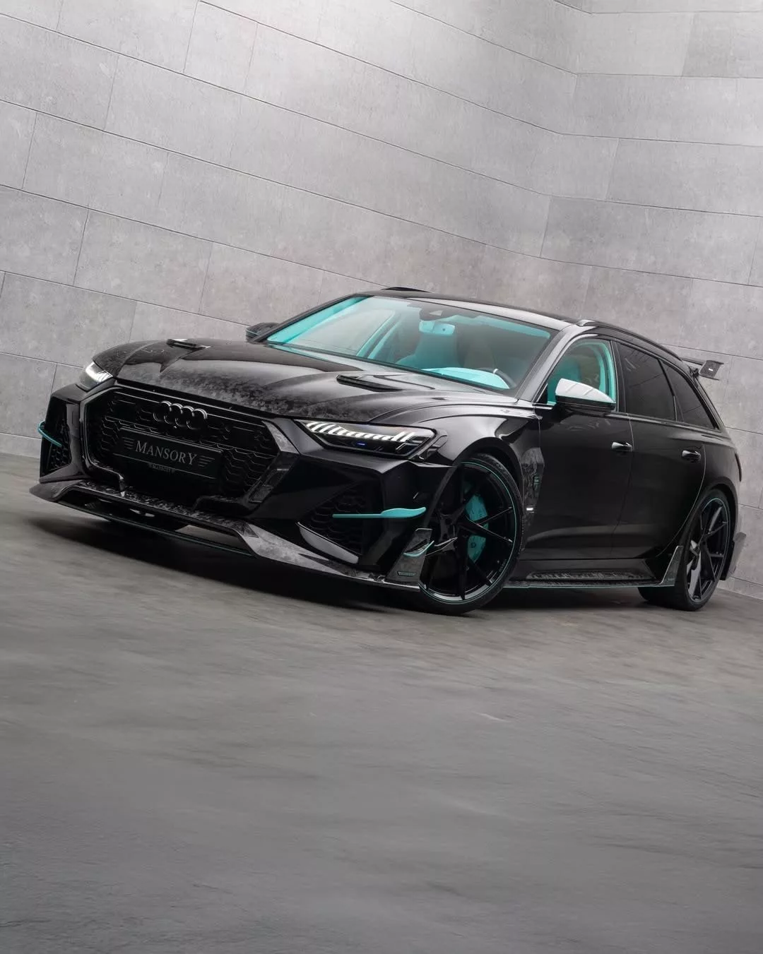 در بخش عقب خودرو نیز شاهد یک بال بزرگ، اسپویلر روی درب صندوق و دیفیوزر بزرگی هستیم که چراغ ترمز اضافه در مرکز آن تعبیه شده است. رینگهای خودرو نیز خاص و سفارشی هستند. بدنه آئودی RS6 آوانت منصوری با رنگ مشکی براق پوشیده شده است و رگههایی از رنگ سبزآبی را میتوان روی آن دید.
